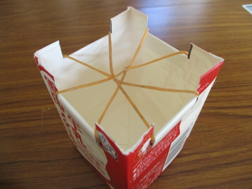 ④切り込みを入れた牛乳バックにゴムを張って十字になるようにしよう。