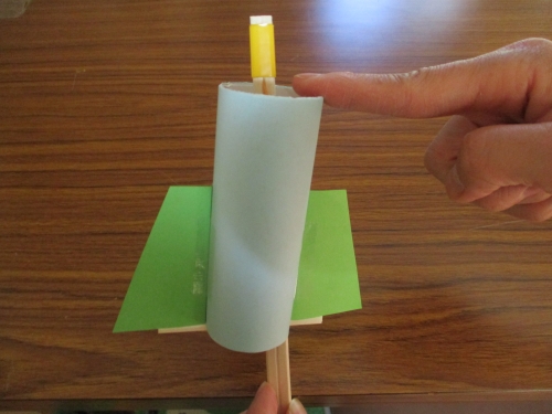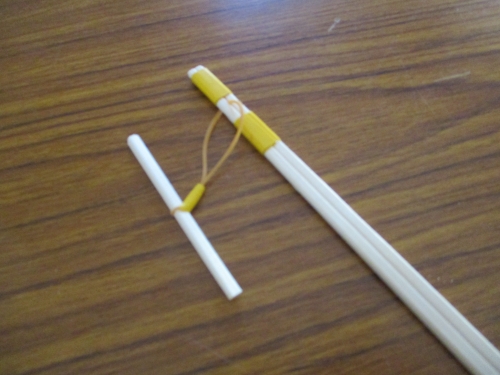 ②割りばしを5cmくらいに切って、輪ゴムの先にテープでつける。